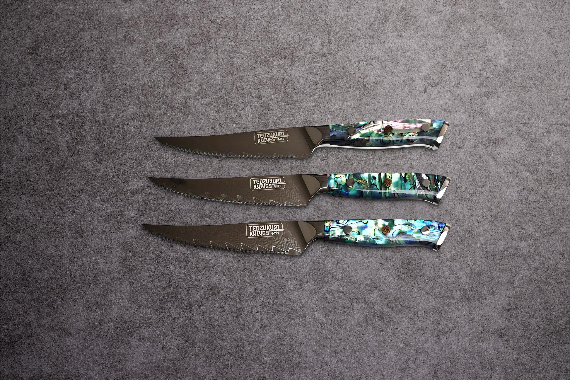 Awabi Steak Knives - 67 Layer Japanese Damascus with Abalone + Acrylic