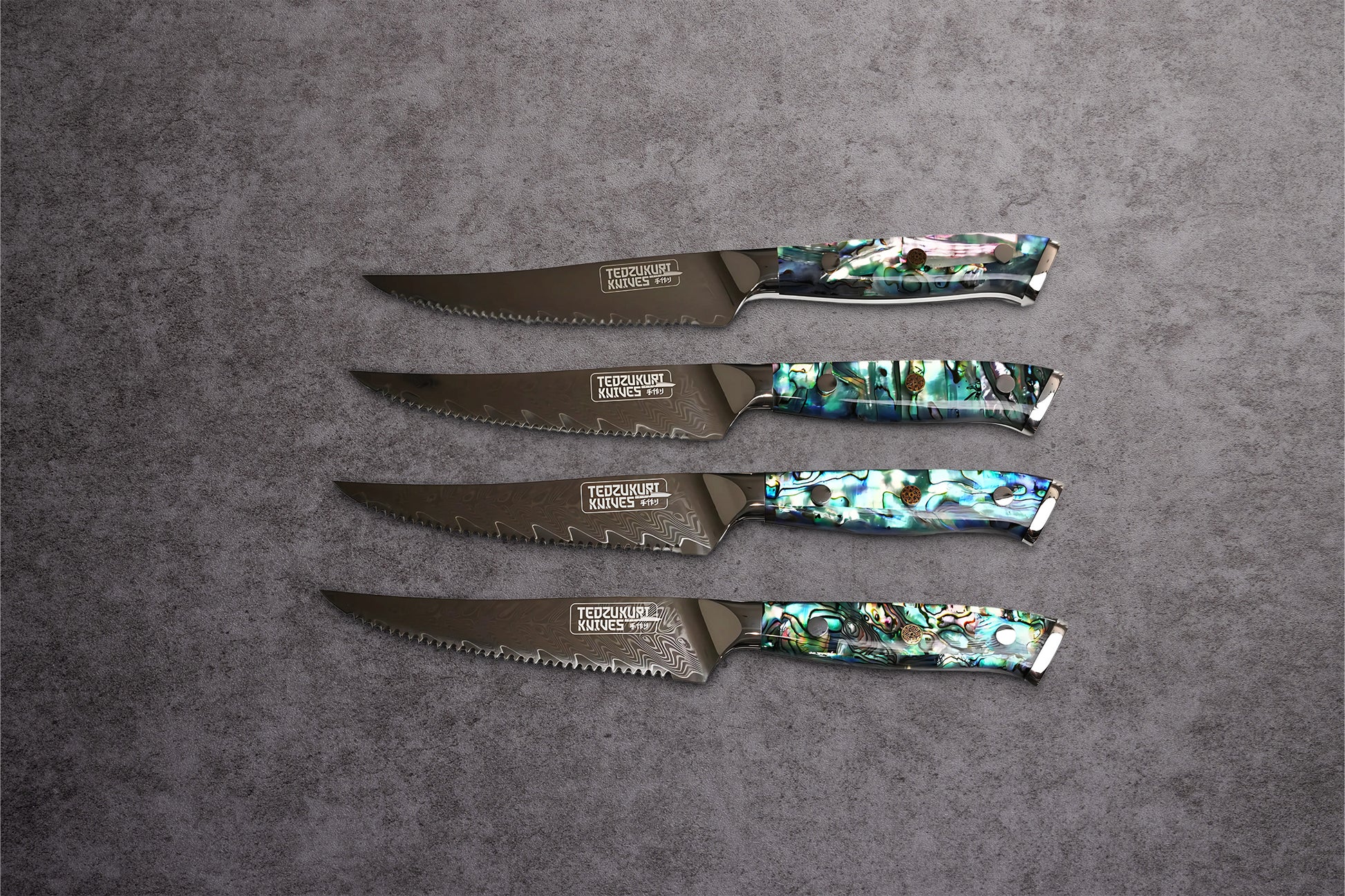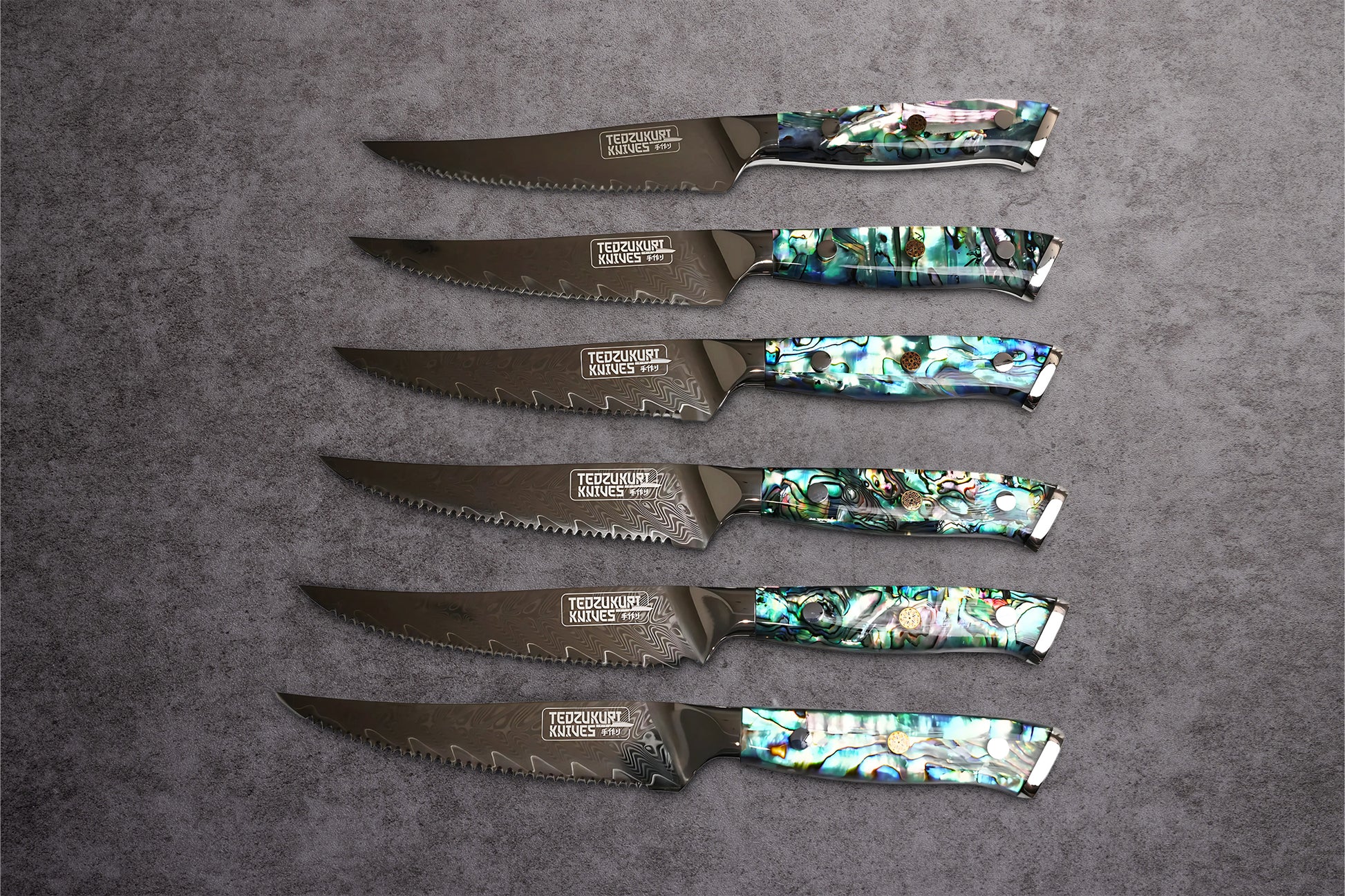 The Awabi Steak Knife Set brings dining to another level—with 67-layer Japanese Damascus steel blades that slice through meat like butter. Each knife is hand-polished for lasting sharpness and features a luminous abalone and acrylic handle that shimmers under the light.