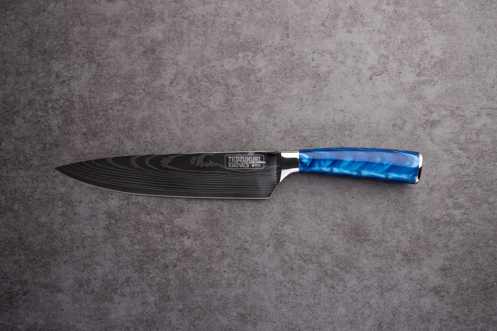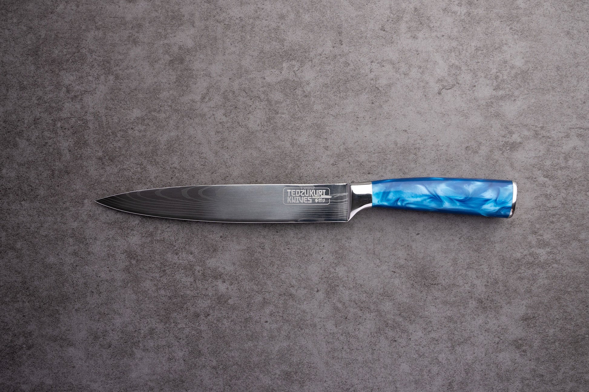 The handles of these knives are stunning, made from high quality, mesmerizing blue acrylic. The result is a beautiful, ergonomic grip that feels comfortable in your hand and provides excellent control.