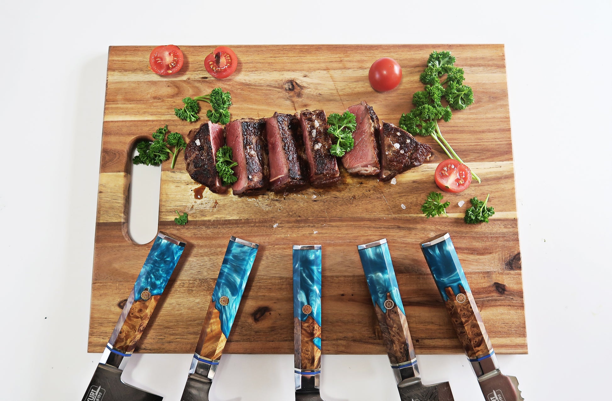 Finished with standout burlwood and acrylic handles, each piece is uniquely patterned—designed to feel good in hand and look even better on display.