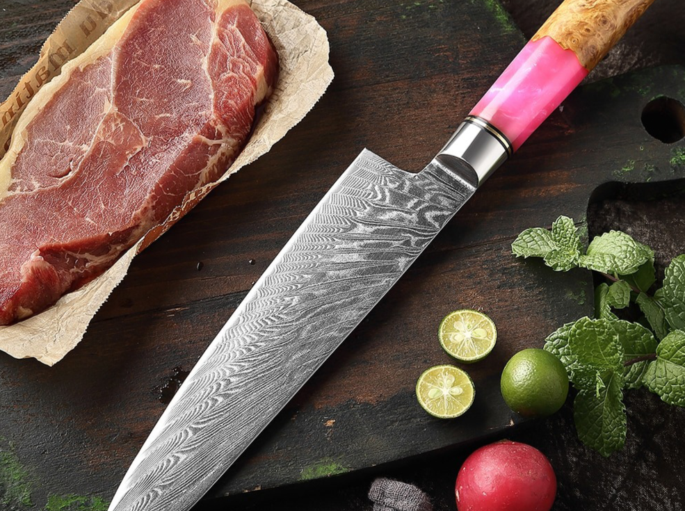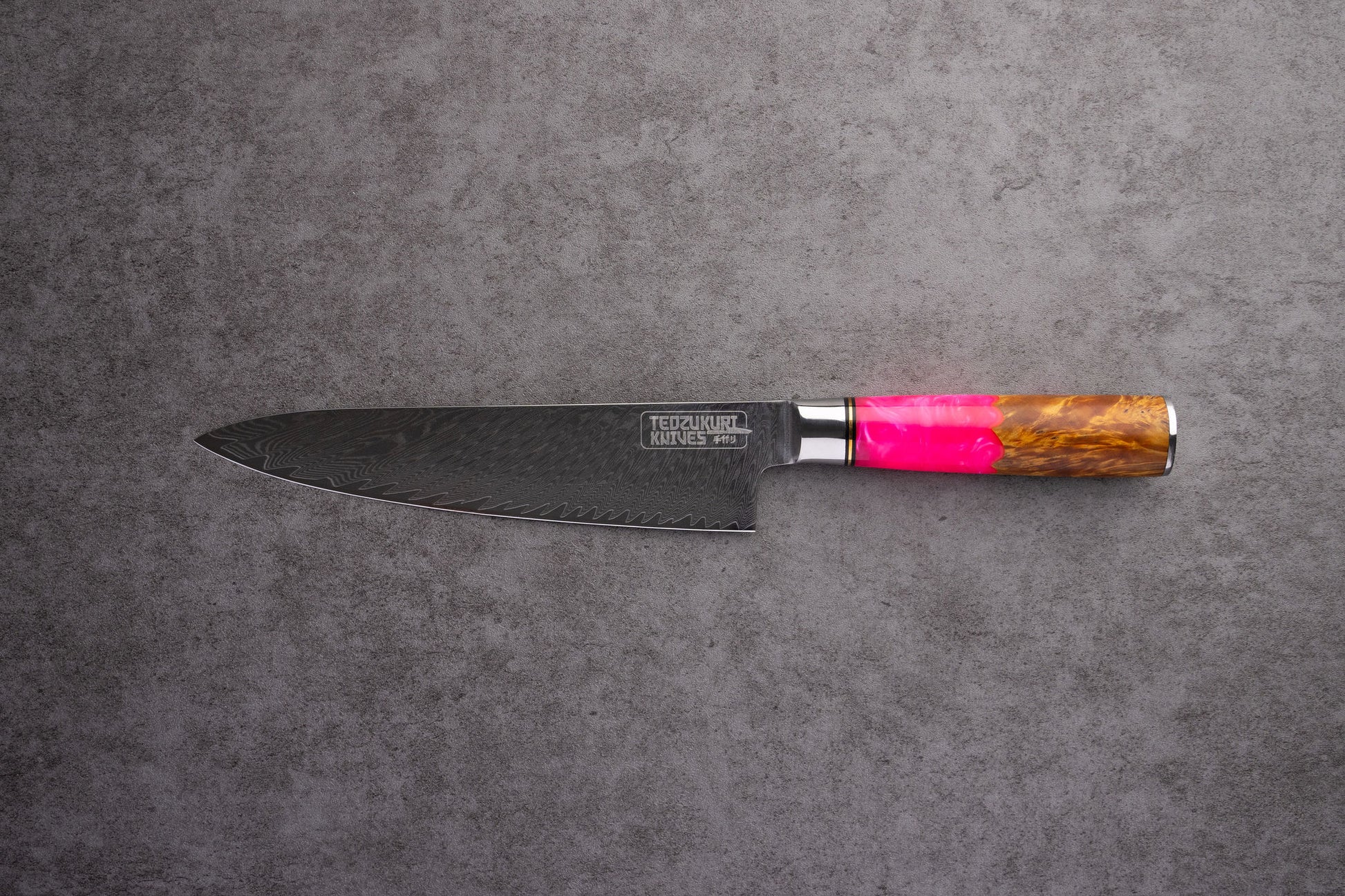 The Pinku Chef knife brings together the beauty of a 67-layer Japanese Damascus steel blade with a show-stopping pink acrylic and burlwood handle. Razor-sharp, perfectly balanced, and made to handle everything from delicate herbs to dense cuts of meat.